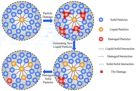 When the particle is damaged (the stress of the particle satisfies the failure criterion of Equation (6) or Equation (7)), the fracture mark ξ is set to be 0. When the particle is not damaged (the stress of the particle does not satisfy the failure criterion of Equation (6) or Equation (7)), the fracture mark ξ is set to be 1. The fracture processes of particles can be shown in Figure 3. Therefore, by improving the liquid–solid coupling governing Equation (5), we can obtain the new governing equations considering the particle damage []:
