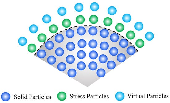(1) Like solid particles, “stress particles” participate in the internal force calculation of SPH. That is, the density, velocity, energy, and position of particles are updated by Equation (9);