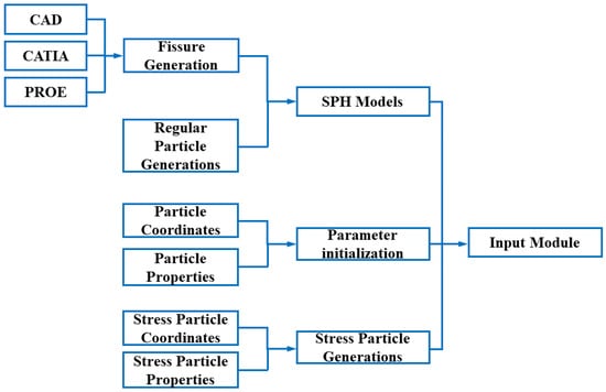 Similar to traditional numerical software, the architecture of the SPH program mainly includes three modules: (1) input module; (2) computing module, and (3) post-processing module. The input module is shown in Figure 5. The SPH model is composed of fissure generations and regular particle generations. The fissure generations can be carried out by CAD, CATIA, and PROE. The parameter initialization comprises the determination of particle coordinates and particle properties, and the stress particle generation comprises stress particle coordinates and stress particle properties, as illustrated in Section 2.3.