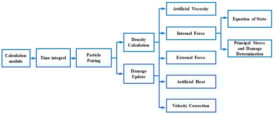 The calculation module comprises 10 parts: (1) Time integral; (2) Particle pairing; (3) Density Pairing; (4) Damage Update Calculation; (5) Artificial Viscosity Calculation; (6) Internal Force Calculation; (7) External Force Calculation; (8) Artificial Heat Calculation; (9) Velocity Correction Calculation; (10) Principal Stress Calculation and Damage Determination. The relationships between the 10 parts can be illustrated in Figure 6.