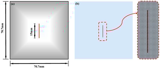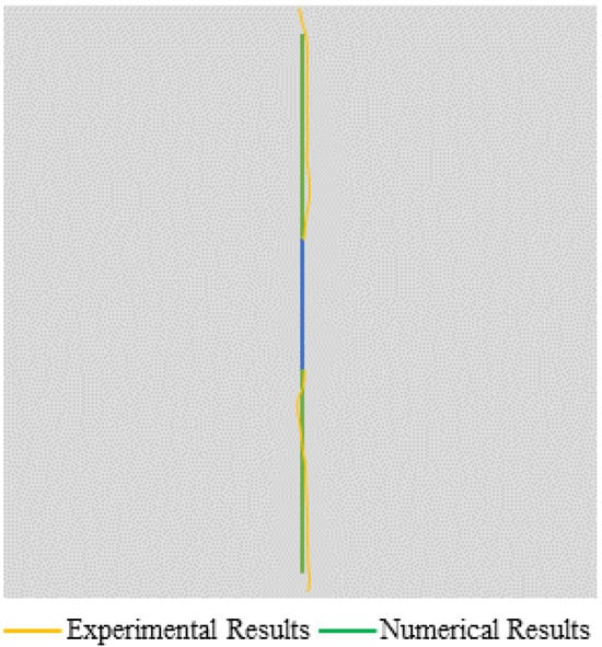 Numerical example 1 comes from reference [], as shown in Figure 7. The specimen size is 70.7 mm × 70.7 mm, and a 15 mm length vertical fissure is prefabricated in the center of the sample. The whole model is divided into 200 × 200 = 40,000 particles. The loading rate of internal water pressure is 50 Pa/calculation step. The model parameters are set as follows: Particle density is ρ = 2600 kg/m3, Elastic modulus E = 17 GPa, Poisson’s ratio μ = 0.14, Cohesion is set to be 5.95 Mpa, internal friction angle is 40°, and the tensile strength is 2 MPa.