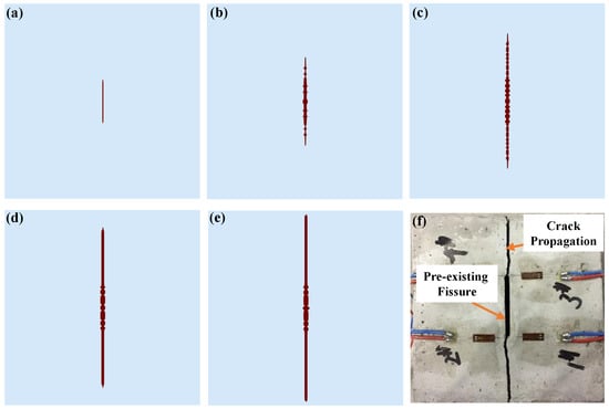The progressive fracture propagation processes of example 2 and its comparisons with previous experimental results. (a) Step 0; (b) Step 22,000; (c) Step 24,000; (d) Step 27,000; (e) Step 31,000; (f) Previous experimental results [].