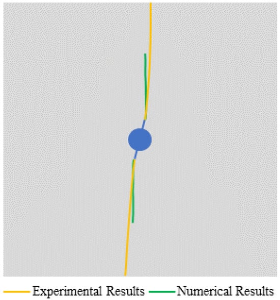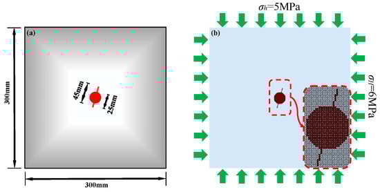 Numerical example 2 comes from reference [], as shown in Figure 10. The model size is 300 mm × 300 mm. A circular hole with a diameter of 25 mm is set in the center of the model; meanwhile, directional prefabricated fissures with a length of 10 mm are set on the two sides of the circular hole, whose dip angles are 75°. The horizontal stress is σH = 6 MPa, and the vertical stress is σh = 5 MPa. The loading rate of internal water pressure is 50 Pa/calculation step. The whole model is divided into 300 × 300 = 90,000 particles. The model parameters are set as follows: Particle density is ρ = 2600 kg/m3, Elastic modulus E = 17 GPa, Poisson’s ratio μ = 0.14, Cohesion is set to be 5.95 Mpa, internal friction angle is 40°, and the tensile strength is 3.2 MPa.