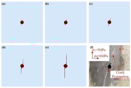 The progressive fracture propagation processes of example 1 and its comparisons with previous experimental results. (a) Step 0; (b) Step 8000; (c) Step 9000; (d) Step 10,000; (e) Step 11,000; (f) Previous experimental results [].