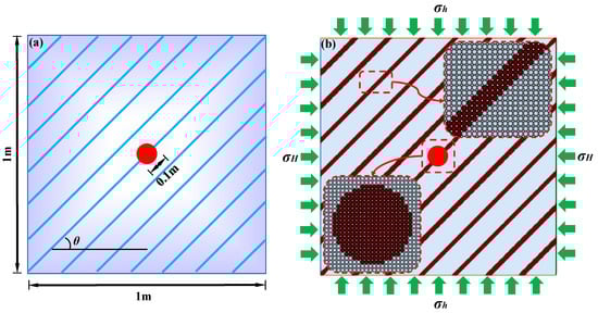 In order to explore the formation rules of a shale hydraulic fracture network under different bedding dip angles and confining pressures, the SPH models containing bedding and hydraulic perforation are established, as shown in Figure 13. The number of layers is defined according to the scale of actual conditions. The model size is 1 m × 1 m. The bedding width is 0.02 m and the bedding distance is 0.08 m. The bedding dip angle θ is defined as the angle between the bedding direction and the horizontal direction. The vertical stress is defined as σh, and the horizontal stress is defined as σH. The whole model is divided into 200 × 200 = 40,000 particles. The model parameters are set as follows: Particle density is ρ = 2600 kg/m3, Elastic modulus E = 17 GPa, Poisson’s ratio μ = 0.14, Cohesion is set to be 5.95 Mpa, internal friction angle is 40°, and the tensile strength is 5.2 MPa.