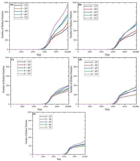 Variations of particle failure counts with calculation steps. (a) σh = 10 MPa, σH = 2 MPa; (b) σh = 10 MPa, σH = 4 MPa; (c) σh = 10 MPa, σH = 6 MPa; (d) σh = 10 MPa, σH = 8 MPa; (e) σh = 10 MPa, σH = 10 MPa.