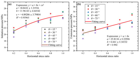 Figure 15a shows the variations of initiation stress with horizontal stress ratio under different calculation schemes. It can be seen that the initiation stress of the bedding shale model increases with the increase of horizontal stress ratio, varying from 19 MPa to 26 MPa. The expression of the fitting curve is y = a + bx + cx2, where a = 18.8432 ± 1.21916, b = 11.96143 ± 4.64542, and c = −4.89286 ± 3.79804. The R2 is 0.95965. Under the same horizontal stress ratio, the initiation stress of small bedding dip angles (θ < 45°) is larger than that of big bedding dip angles (θ > 45°). Figure 15b shows the variations of extension stress with horizontal stress ratio under different calculation schemes. The expression of the fitting curve is y = a + bx, where a = 25.8134 ± 0.22906 and b = 6.661 ± 0.34532. The R2 is 0.992. It can be seen that extension stress basically increases linearly with the horizontal stress ratio, varying from 25 MPa to 35 MPa. When the horizontal stress ratio is 0.2 and the bedding dip angle θ > 30° or the horizontal stress ratio is 0.4 and the bedding dip angle θ > 45°, the buckling stress will be greater than 40 MPa.