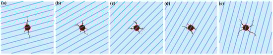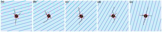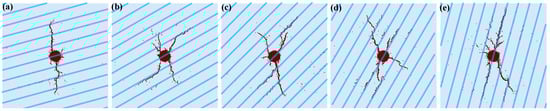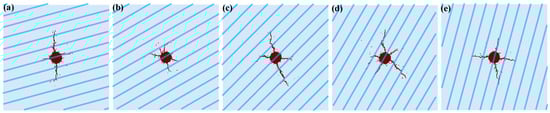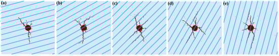 Hydraulic fracture morphology when horizontal stress ratio is 1. (a) θ = 15°; (b) θ = 30°; (c) θ = 45°; (d) θ = 60°; (e) θ = 75°.
