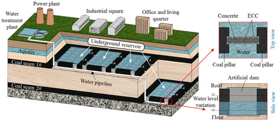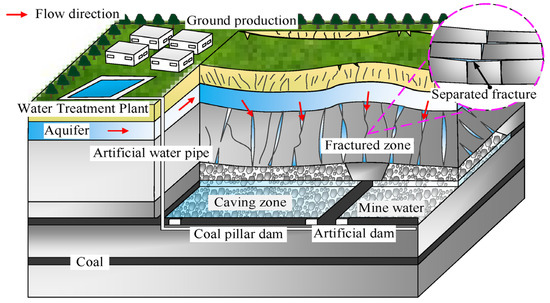 Due to the shallow burial of coal seams, large seam thickness, and thin overlying bedrock in the central and western regions, the full-height mining of coal seams inevitably caused the overlying strata to fracture and connect with aquifers, resulting in significant underground water leakage and loss [10,11,12]. In response to this situation, traditional passive water-preserving mining techniques, characterized by “blocking” underground water leakage, were previously employed in coal mines. Techniques such as limited height mining, backfill mining, and partitioned mining were utilized to ensure that the overlying strata fractures caused by coal extraction did not connect with aquifers, thereby preventing damage to the aquifer structure [13,14,15]. Within the coal mine field, groundwater was found to converge towards the mining area (goaf). It is estimated that every 10,000 t of coal produces 1000 to 1600 m3 of void space. These spaces provided conditions for storing mine water and were considered ideal locations for mine water storage [16]. Based on the characteristics of the collapsed space in the goaf and drawing on traditional underground reservoir construction concepts [17], a new concept was proposed by Gu to address the phenomenon of water resource evaporation and loss during coal mining in western China’s mining areas. This concept involved constructing CMURs in the goaf caved zones to achieve underground storage and the utilization of mine water, representing water resource protection technology characterized by “conducting” [6,7,18,19]. This technology enabled the safe underground storage and utilization of mine water, preventing evaporation losses associated with surface discharge. The theoretical framework and technical system of CMURs were widely promoted and applied in mining areas such as Shendong. With a maximum storage capacity of 35 Mm3, these reservoirs supplied over 95% of the production, domestic, and ecological water needs of the mining areas, and also provided water for nearby power plants and coal-to-oil projects, achieving a transition from major water consumers to major water suppliers [20].