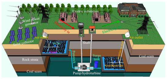 - Jiang, D.Y.; Chen, S.; Liu, W.H.; Ren, Y.W.; Guo, P.Y.; Li, Z.Z. Underground Hydro-Pumped Energy Storage Using Coal Mine Goafs: System Performance Analysis and a Case Study for China. Front. Earth Sci. 2021, 9, 15. [Google Scholar] [CrossRef]