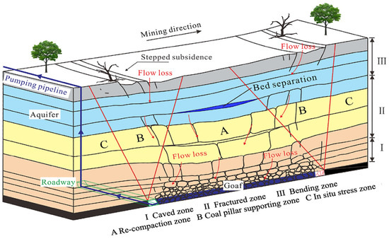 The “three zones” of the goaf and hydraulic migration (modified from [37]).