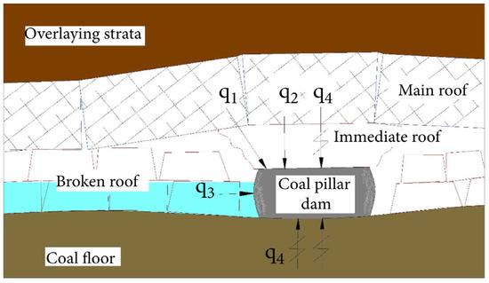 Stress environment of coal pillar dams (modified from [61]). (q1, side abutment pressure; q2, overlying strata gravity; q3, hydrostatic pressure; and q4, dynamic stress).