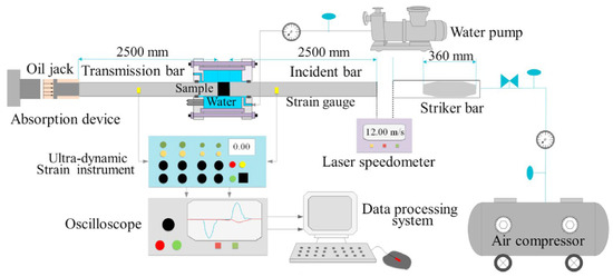 Researchers have addressed the issue of dynamic load disturbance to coal pillar dams caused by mining activities and mine-induced seismic events. It has been shown that the impact loads generated by mining disturbances and mine seismic events propagate as stress waves through the rock layers, causing damage to the coal pillar dams. Additionally, the weakening effect of water erosion has made the study of the stability of coal pillar dams under dynamic loads more complex. The mechanical properties of coal pillar dams under the influence of vibrational loads have mainly been studied using split Hopkinson pressure bar (SHPB) tests to examine the dynamic mechanical characteristics at high strain rates. Here, the dynamic compressive strength and elastic modulus followed exponential and logarithmic functions of the strain rate, respectively, showing a significant positive correlation. As the water content increased, the dynamic elastic modulus increased almost linearly, while the compressive strength gradually decreased. Under the same impact load, samples with higher water content failed more quickly, and the expansion of parallel cracks into intersecting cracks exacerbated the damage [68,83]. However, some studies indicated that the presence of water pressure had a positive effect on the samples, increasing the dynamic strength of the coal pillar samples and reducing the failure strain [84]. Figure 12 shows an innovative SHPB experimental apparatus that considers water pressure [84].
