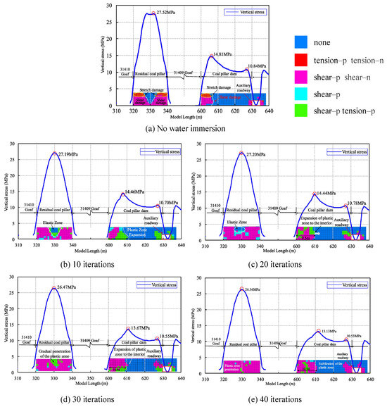 An important cause of damage to coal pillar dams after water immersion is the softening effect of water on coal. To investigate the damage and degradation characteristics of coal pillar dams under water softening, it has been necessary to obtain real-time feedback the relationship between the mechanical parameters of the coal pillar and the water content and pore water pressure into the research model [89,90]. Therefore, many scholars have adopted numerical simulation methods [49,63,91,92]. Numerical simulation allows for the convenient, simultaneous output of the stress patterns, fracture patterns, and seepage patterns of coal pillar dams. Detailed comparative analysis of the stress distribution, pore water pressure distribution, and plastic zone expansion patterns of coal pillar dams, with and without the influence of water immersion, can intuitively reflect the impact of water immersion on coal pillar dams. In these works, the strength of the coal pillar dam decreased after water immersion, leading to a gradual increase in the plastic zone of the coal pillar. The development of the plastic zone caused stress redistribution and transfer to the deeper parts of the coal pillar. Damage and degradation allowed water to infiltrate the coal pillar dam, further reducing the coal pillar’s strength. During the immersion process following mining disturbances, the coal pillar dam exhibited progressive failure, with the depth of the plastic zone development corresponding to the location of the vertical peak stress. The coal pillar exhibited a “damage–seepage–accumulated damage” effect in a water immersion-stress coupling environment. As water immersion deepened, the permeability in the elastic zone of the coal pillar decreased, the weakening effect of water immersion gradually diminished, and the damage to the coal pillar stabilized [61,75]. Figure 14 provides a detailed illustration of the stress patterns and plastic zone expansion of coal pillar dams with and without the influence of water immersion [75]. Additionally, under the influence of dynamic loads, it has been shown that the stress concentration within the coal pillar dam increases and the range of the high-stress zone expands and gradually extends towards the elastic zone and the floor. The disturbance effect of near-field mine seismic loads on the coal pillar dam is significant. The stress concentration level increases after the dynamic load ended, leading to more severe damage to the dam [68].