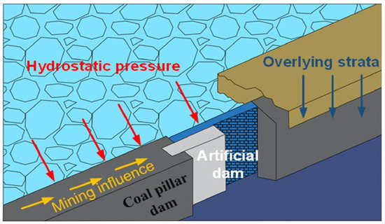 Similar to coal pillar dams, artificial dams in CMURs are also subjected to the coupled effects of stress and seepage. In addition to the pressure from the overlying rock layer, mining-induced stress, and water pressure, artificial dams, used to connect the spaces between adjacent sectional coal pillars, are also subjected to friction and compression forces from the coal pillars on both sides (referred to as coal pillar forces) [96,97], as shown in Figure 16 [98]. Additionally, unlike the material properties of coal, the primary construction material for artificial dams is concrete. As a typical porous material, concrete is significantly affected by water seepage. This effect is particularly notable when mine water is highly saline, as the high concentration of salt ions in the water can react with the components of the concrete, further damaging the strength of the artificial dam.