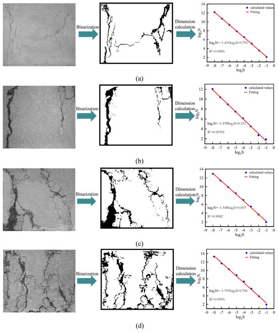Macro failure fractal dimension of concrete samples: (a) dry, (b) 1 dry–wet cycle, (c) 3 dry–wet cycles, and (d) 5 dry–wet cycles (adapted from [99], with permission from Elsevier, 2024).