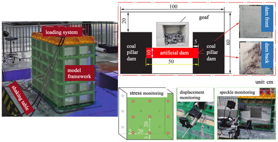 Since the size of the artificial dam is much smaller than that of the coal pillar dam and is constructed through post-mining artificial pouring, vibrations and mine seismic activities caused by mining operations frequently occur. These uncertain loads, along with geostress and water pressure, have become common load forms [102]. The study of the seismic performance of artificial dams is identified as a crucial aspect in ensuring safety throughout its lifecycle and forms the basis for monitoring and early warning in field engineering practice [103]. Unlike the study of the mechanical properties of coal pillar dams under vibrational loads, which commonly uses SHPB tests, the smaller size of artificial dams allows for the use of similar simulation combined with shaking table tests to study the mechanical properties of artificial dams under different vibrational loads. These findings can then be validated through numerical simulation tests. Figure 18 illustrates a reasonable test system combining similar simulation and shaking table tests [53].