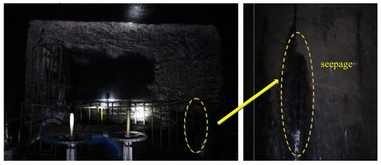 As previously mentioned, the thickness of the coal pillar dam reaches tens of meters, whereas the thickness of the artificial dam is only a few meters. Additionally, because the artificial dam is poured at a later stage, the connections between the concrete structure and the roof, floor, and adjacent coal pillar dams are highly susceptible to leakage under water pressure and require special attention. For example, a slight leakage occurred in the MB-1 artificial dam at the Wulanmulun mine, as shown in Figure 19 [54]. The coal pillar dam, with a thickness of approximately 80 m, exhibited good impermeability, and therefore, no leakage was observed. Preliminary analysis suggested that the leakage in the artificial dam stemmed from the incomplete collapse of the goaf, which led to weak connections between the dam and the surrounding rock in the roof. Additionally, the deformation and crack propagation patterns of the artificial dam under different water pressures directly affected the seepage patterns. Therefore, for artificial dams, much of the research has focused on their seepage patterns.