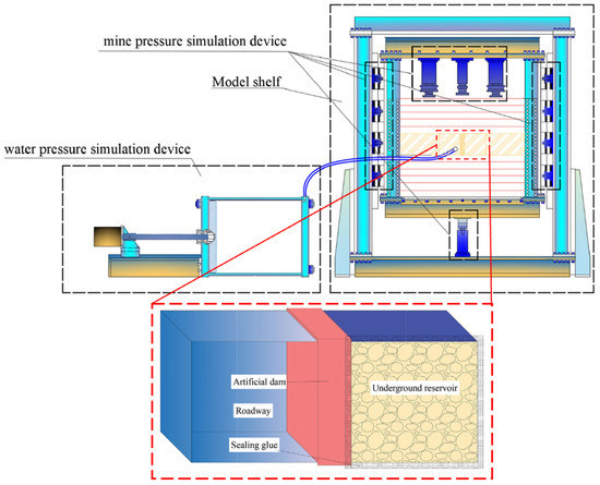 Kong et al. [54] and Fang [55] conducted similar experimental studies on the stress, fracture, and seepage patterns of artificial dams under the influence of water pressure and mining pressure using a self-developed nested multi-coupled test system. The test system is shown in Figure 20 [54]. The results indicated that an increase in water pressure and model top load both led to an increase in the deformation of the artificial dam surface. Under the influence of water pressure, seepage occurred sequentially at the following locations: the bottom slot of the artificial dam, the top slot of the artificial dam, the coal pillar dam, the reservoir floor, the reservoir roof, the roadway roof, the roadway floor, and the surface of the artificial dam. As the water pressure increased, the permeation boundary range on the model surface gradually expanded. The failure of the artificial dam was characterized by compression-shear failure, with cracks extending from the lower outer side of the artificial dam model to near the upper inner vertex, penetrating the entire artificial dam at an approximate 45° angle to the cross-section, as shown in Figure 21.