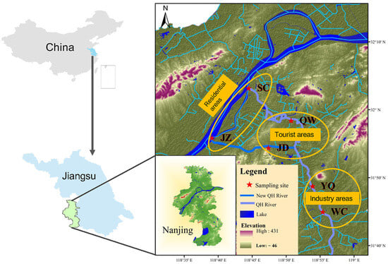 The Qinhuai River, referred to as the QH River, is the primary river in Nanjing City, Jiangsu Province, spanning around 110 km. The studied area is situated between 31°40′ and 32°10′ N latitudes and 118°35′ and 119°0′ E longitudes, including various stream sections for upstream (WC and YQ), midstream (JD and QW) and downstream (JZ and SC) in Figure 1. The central section of the river in Nanjing is traversed by two main tributaries, namely the QH River in the northwest and the New QH River in the west. The upper reaches of the region are predominantly characterized by industrial zones, but the middle reaches are characterized by the presence of parks and a thriving tourism industry. The lower sections, on the other hand, consist mainly of residential districts. The topography of the studied river exhibits a south-to-north gradient, characterized by steep inclines and alluvial fans at the higher elevations and gradual slopes in the middle and lower regions. The sampling strategy primarily aims to acquire samples from varied areas in the water environment, which includes six sampling sites with three parallel samples.