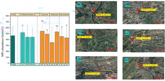 Overall spatial distribution of microplastic abundance in the Qinhuai River. (Significant differences between the different groups are shown by * (p < 0.05) and ** (p < 0.01)).