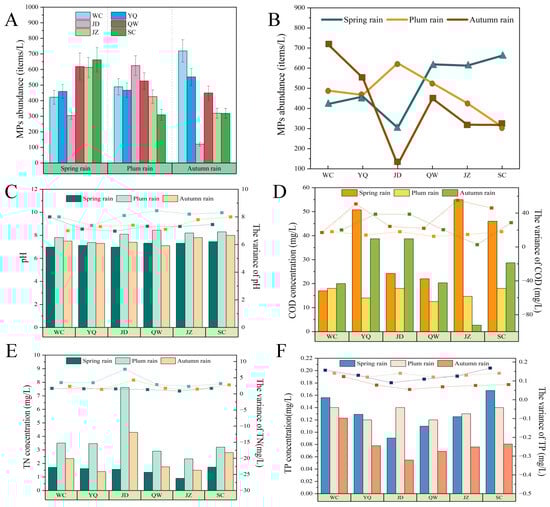(A) Temporal distribution of microplastics in the rainy seasons. (B) Temporal variances of microplastics in the sampling sites, and water quality parameters (C) pH, (D) COD, (E) TN, (F) TP in the studied rainy seasons.