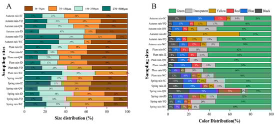 The microplastics found in Qinhuai River exhibited a variety of colors, such as yellow, red, transparent, green, blue, and black (Figure 4B). Throughout all seasons, the predominant color was green, which occupied 25–69%. Blue and transparent microplastics exhibit greater prevalence compared to colored plastics, corroborating previous research findings [,]. Seasonal variation significantly influenced the color of microplastics. The dominant colors were blue, black, and yellow, which occupied 7–28% of blue and 4–20% of yellow in spring rain, and 3–67% of yellow in autumn rain. Previous studies also found that the occurrence of microplastic color was predominantly observed in green and transparent forms [], suggesting a potential correlation with population behavior in specific regions. Transparent MPs were more even in many sampling sites and seasons, accounting for around 8–24% in spring rain seasons, 11–29% in plum rain, and 13–19% in autumn rain, respectively.