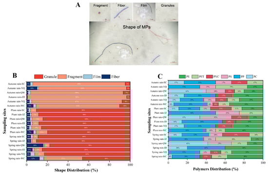 Figure 5A displays the visual appearance of microplastics, and the distribution of microplastics is depicted in Figure 5B. The most commonly observed forms of microplastics in the QH River are granules, followed by fragments. The results indicate a high occurrence of granules and fragments in urban rivers, highlighting the importance of recognizing the substantial impact of granular and fragment microplastics in urban rivers. Interestingly, granule dominates in spring rain and plum rain, accounting for 46~90%, while fragment predominance in autumn rain with a percentage of 81~96%. Seasons variation showed a significant impact on the shapes of microplastics. Previous research has also confirmed that granules and fragments are the prevailing components in both seawater and river sediment []. Granules primarily stem from the usage of cleaning and cosmetic products, along with the breakdown of larger biodegradable plastic materials []. Concurrently, there was a noticeable upward tendency in fiber change during the spring and plum rain seasons. The presence of microplastic fibers in home trash greatly contributes to the discharge of microplastic pollution, resulting in a significant impact. Furthermore, it is probable that fiber-like microplastics will arise from big plastic blocks, which are vulnerable to temperature changes, wind, water flow, and abrasion by hard objects during migration. Therefore, the spring and autumn seasons produce more garbage with heavier volumes of clothing, producing more fiber MPs, which aligns with the elevated concentration of larger-sized microplastics during the autumn rainy season.