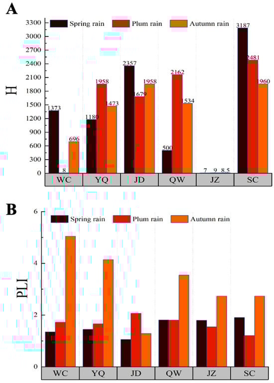 Water samples were taken to investigate water quality parameters in the Qinhuai River (Figure 3C–F). The pH concentration exhibited a consistent level of stability across the sampling sites, which was consistent with TP and TN concentrations in autumn rain. For TP and TN concentrations, plum rain showed a relatively higher abundance than other rain seasons, which revealed that rainfall would increase the TP and TN concentrations. This phenomenon can be primarily attributed to the propensity of phosphorus to become immobilized within the soil, coupled with its facile horizontal transportation through particle-laden runoff during periods of intense rainfall. In the dry season, a substantial quantity of phosphorus readily accumulates on the soil surface. As heavy rainfall occurs, the previously accumulated phosphorus is mobilized into the river, causing a marked upsurge in phosphorus concentration within the river water during the rainy season. The scouring effect of early rainy season runoff exacerbates the presence of phosphorus in surface water while diminishing the influx of phosphorus in the autumn rainy seasons with decreasing rainfall. Meanwhile, TN concentrations were volatile and higher in plum rain than in other seasons, while the COD was more stable in plum rain seasons. Overall, different seasons perform different rainfall characteristics.