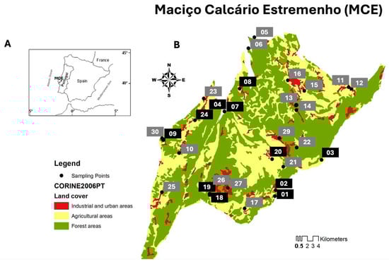 (A) Map of the location of the Maciço Calcário Estremenho (MCE) in Portugal and in the context of Southwestern Europe; (B) map of the sampling sites location at the MCE—the sites with samples used in the present study are highlighted in black boxes.