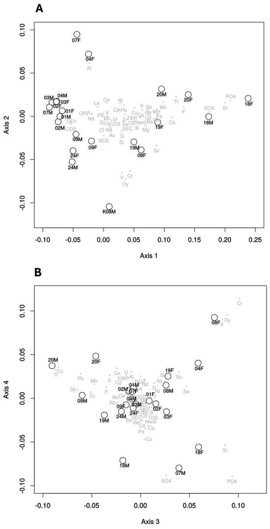 The analysis of the environmental data set indicated significant differences in environmental conditions among sampling sites (see Figure 2). The main synthetic environmental gradient (PCO1: variance explained: 61%) separated sites (08, 18–20) with relatively high values of parameters such as Sr, SO4 and PO4 from remaining sites with relatively high values of OD1 (mg L), OD2 (%) and ORP. The second gradient (PCO2: variance explained: 12%) separated sites (08) with relatively high values of V and Cr from sites with relatively high values of Al (04 and 07 in February). The third axis (PCO3: variance explained: 11%) separated sites with relatively high values of Sr, PO4, V and Cr (07M, 18F, 04F and 08F) from sites with relatively high values of Cl, Cu, Pb, Mn and Zn (09M, 19M, 20M and 20F). The fourth axis (PCO4: variance explained: 10%) separated sites with relatively high values of Fe, Cs and SO4 (18M and 07M) from sites with relatively high values of V (08F). The recorded environmental parameters showed marked variations across groundwater samples. Electrical conductivity (CE) varied between 397 and 2001 mS cm−1, at 04F and 18F, respectively, whereas pH varied between 6.6 (at 18M) and 7.49 (at 02M). Water temperature ranged from 15.90 to 20.54 °C (at 03F and 20F, respectively), depending on borehole depth. Samples from sites 01 and 02 had the highest dissolved oxygen concentrations (>10.00 mg L−1) in February. Sample 09M had the highest oxidation–reduction potential (ORP) (431.8 mV) and the highest concentration of Zn (56.3 mg L−1).