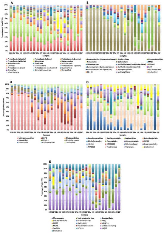 Relative abundance of bacterial 16S rDNA fragments from the Maciço Calcário Estremenho groundwater samples (with a contribution of 1% or more in at least one sample): (A) total bacteria at the phylum level, including Proteobacteria at the class level; (B) Betaproteobacteria at the order level; (C) Alphaproteobacteria at the order level; (D) Gammaproteobacteria at the order level; and (E) Deltaproteobacteria at the order level.