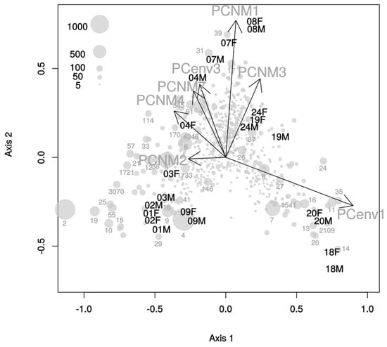 - Borcard, D.; Legendre, P. All-Scale Spatial Analysis of Ecological Data by Means of Principal Coordinates of Neighbour Matrices. Ecol. Model. 2002, 153, 51–68. [Google Scholar] [CrossRef]