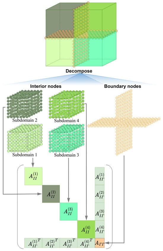 where and are the blocks associated with only interior nodes and boundary nodes, respectively, is the block of coefficients connecting interior and boundary nodes, and are the variables of interior and boundary nodes, respectively, and and are the associated blocks on the right-hand side for these two categories of nodes. By further rearranging the columns of interior nodes based on their respective subdomains, the blocks in Equation (4) can be further refined and formulated as follows: