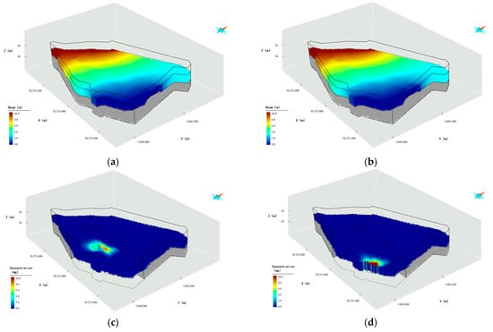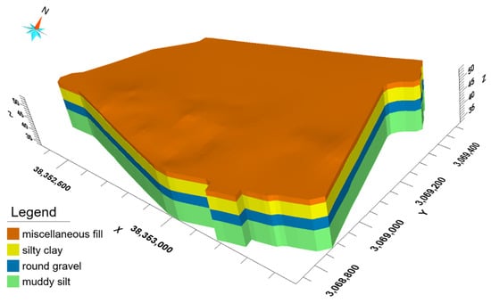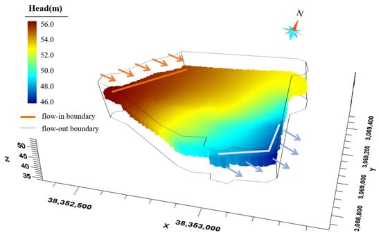 Figure 6 illustrates the northwest boundary condition, which specifies the flux along the northwest boundaries, representing the lateral flow recharge northwest of the site. The southeast boundary condition is a specified-head boundary set uniformly to a constant. A uniform recharge rate of m/s is applied to the northwest boundary, and a water head of 48 m is used for the outflow boundary (southeast boundary) based on the river stage of the Lianshui River. The top boundary condition is defined as a flux-specific boundary representing the rainfall recharge at a rate of 1400 mm/yr based on the region’s annual precipitation. The bottom boundary condition is a no-flow boundary since the silty mudstone layer at the bottom of the aquifer is considered impermeable. In the solute transport model, all boundaries except the southeast (outflow) boundary are set to zero-mass flux. The mass flux for the southeast boundary is set to the outflow rate through the boundary. Besides the above boundary condition, the other model parameters are set according to our previous work [].