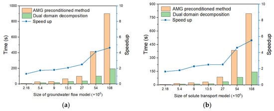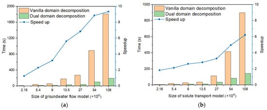 Comparison of solution time and speedup ratio between dual-domain decomposition and vanilla domain decomposition methods at different model sizes. (a) Groundwater flow model; (b) Solute transport model.