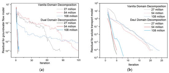 Convergence comparison between dual-domain decomposition and vanilla domain decomposition methods at different model sizes: (a) Groundwater flow model; (b) Solute transport model.