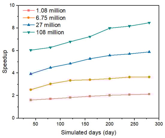 In groundwater simulations over a time sequence, precomputed matrix factorization techniques as explained in Section 2.4 and Section 2.5 can accelerate the simulation of groundwater flow and transport processes. We compared the performance between the dual-domain decomposition and vanilla domain decomposition methods when employing the precomputation trick in time-sequential simulations. The groundwater flow and transport were simulated over 280 days (Figure 9), with a time differential step of 1 day. Table 6 and Figure 10 present the runtime and speedup values achieved in the time-sequential simulation. Our results demonstrate that the dual-domain decomposition method maintains a superior time efficiency compared to that of the vanilla domain decomposition approach, achieving a speedup of 8.46× with 108 million degrees of freedom.