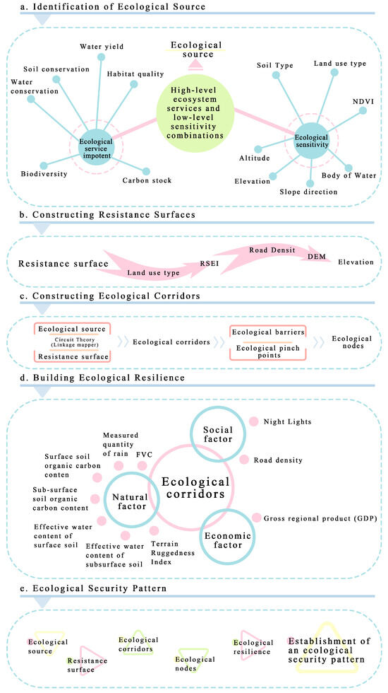 In the 21st century, the rapid expansion of urbanization and industrialization has led to significant detrimental impacts on ecological systems, including biodiversity depletion, degradation of ecosystem services, and increased ecological vulnerability [1]. These challenges threaten the development of national economies and societies, highlighting the urgent need for ecosystem restoration and functional optimization. In response to these needs, the concept of Ecological Security Patterns (ESP) has been developed, serving as a strategic framework not only for landscape planning but also for management that directly addresses the relationship between landscape structure and ecological function [2]. By focusing on the restoration of degraded ecosystems through structural optimization, ESP not only achieves rehabilitation but also bolsters resilience, providing a foundational approach for practical implementation. This strategy has not only guided practical applications but has also spurred further research into identifying and delineating urban ecological networks, thus advancing the design and enhancement of ecological networks in diverse geographical contexts such as plains and watersheds.