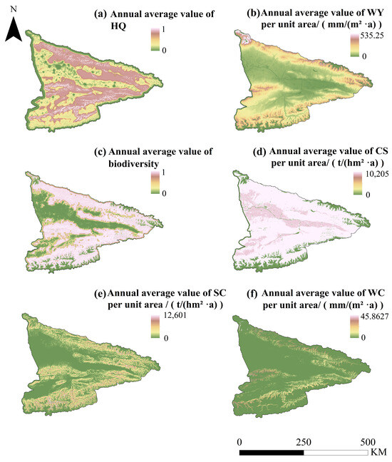 Ecosystem services comprise the diverse natural products and environmental resources that ecosystems provide for societal use [30]. In the Ili River Valley, by utilizing the InVEST model, we quantified key factors such as biodiversity, water yield, soil retention, habitat quality, carbon sequestration, and water production. Water yield is calculated by evaluating vegetation net primary productivity and soil moisture saturation [31]. Soil retention is estimated by comparing potential soil erosion with actual soil deposition [32]. Habitat quality reflects the ecosystem’s capacity to support species survival, reproduction, and interaction, directly linked to biodiversity [33]. Carbon sequestration involves the capture and storage of atmospheric carbon dioxide [34], and water production measures the capture and storage of precipitation as water resources [35]. To optimize data processing efficiency, all factors were converted into 500-meter resolution raster images. We normalized the six ecosystem services to eliminate scale differences between them. Next, we utilized the raster calculator in ArcGIS to equally weight and sum these six services. Finally, we applied the natural breaks classification method to categorize the aggregated results into five distinct classes, thereby forming a comprehensive evaluation of the ecosystem services.