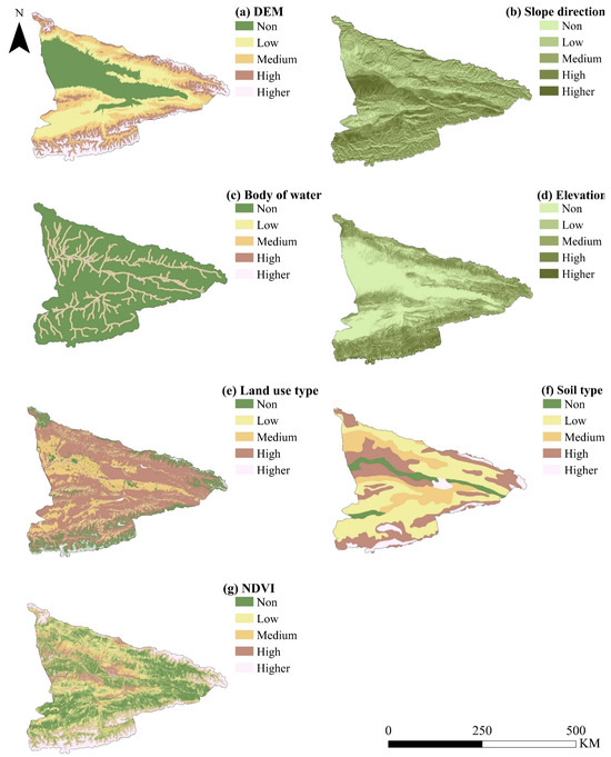 Ecological sensitivity demonstrates an ecosystem’s responsiveness to disturbances from human activities and natural environmental changes [36]. Within the Ili River Valley, considering human, natural, and geographical factors, seven key elements were identified to assess ecological sensitivity: elevation, slope, aspect, bodies of water, vegetation, soil type, and land use type. The Analytic Hierarchy Process (AHP) was employed, employing the yaahp software to calculate and validate the consistency of each factor’s weights, as detailed in Table 2 [37].