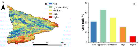 Comprehensive evaluation of ecological sensitivity: (a) Comprehensive ecological sensitivity; (b) Corresponding level area.