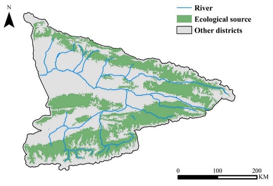 The evaluation of ecological protection significance combines spatial overlays of ‘high’ and ‘relatively high’ ecosystem service outcomes with ‘non-sensitive’ and ‘low sensitivity’ assessments derived from the ecological sensitivity evaluation. This integration provides the foundation for identifying ecological source areas. Initially, numerous small and fragmented patches were identified using ArcGIS tools for aggregation and face elimination; these were consolidated into preliminary source areas. Subsequently, a threshold for patch size and number was established, and patches falling below this threshold were excluded. The remaining patches were then identified as ecological source areas.