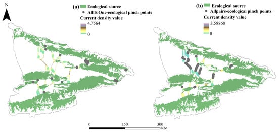 This study utilized the Pinch-Point Mapper tool to identify ecological pinch points in the Ili River Valley using two configurations: ‘allToOne’ and ‘allpairs’. In the ‘allToOne’ configuration (Figure 9a), the peak current density reached 3.58865, typically concentrated at junctions between corridors and source areas. Conversely, in the ‘allpairs’ mode (Figure 9b), the maximum current density was 4.7564, with currents more uniformly distributed along the corridors. An analysis using the natural break method revealed 96 ecological pinch points, with approximately 74% identified under the pairwise configuration. These pinch points are primarily found in low-resistance areas such as rivers, grasslands, and forests, which are crucial for enhancing the ecological network. Pinch points at the intersections of corridors and source areas are especially vital for network connectivity and thus require targeted protection to maintain ecosystem integrity.