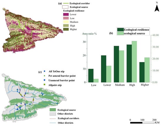 The ecological security pattern of the Ili River Valley: (a) Integrated resilience coupled with ecological network; (b) Ecological sources vs. resilience areas; (c) Ecological network.