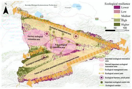 This paper defines the ESP as “three belts, two zones, and three nodes” (Figure 12). The three ecological source belts are determined by the locations of key ecological source areas; the two essential restoration zones are delineated based on attributes including diminished ecological restoration capacity and extensive grassland degradation; the three ecological node restoration areas are identified in regions characterized by significant ecological bottlenecks and barriers. By developing an ecological network pattern, the strategy integrates the natural ecosystems of the Ili River Valley seamlessly, establishing a comprehensive ESP that encompasses various ecological nodes and corridors. This network not only facilitates the systematic implementation of the security pattern but also highlights the unique ecological framework of the Ili River Valley.