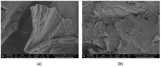 The surface morphology of the pre-AMBC and AMBC was characterized using a scanning electron microscope, as shown in Figure 1, revealing that they exhibited lamellar structures composed of polyaromatic carbon layers. Compared with pre-AMBC, the lamella of AMBC was smaller and the surface was rougher, which may have led to the increase in the specific surface area and porosity of the AMBC.