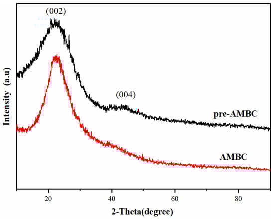 Figure 2 shows the XRD spectrum of pre-AMBC and AMBC, which exhibits a broad diffraction peak between 20° and 30°. The peak correspond to the diffraction of C(002) [33] indicates that the carbon-based solid acids consisted of aromatic carbon sheets. Therefore, it can be inferred that the prepared carbon material was an amorphous carbon adsorbent [34]. In addition, the XRD spectrum of pre-AMBC showed a weak diffraction peak between 40° and 50°, which can be attributed to C(004). Xue et al. [24] showed that the latter peak was due to the α axis of the graphite structure. The peak could hardly be observed in the XRD spectrum of the AMBC, indicating that the graphitization degree of the AMBC was lower and the carbon layer size was smaller, which is consistent with the results of the SEM.