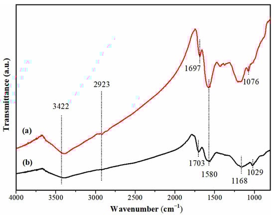 The functional groups on the AMBC and pre-AMBC were characterized based on the FT-IR spectra, and the results are shown in Figure 3. Both spectra showed a peak around 1580 cm−1, which was attributed to the stretching of the C=C bonds formed during the carbonization of the carbon-based solid acid. This suggests the formation of polycyclic aromatic carbon due to incomplete carbonization of the peanut shells [35,36]. The peaks near 1703 cm−1 and 2923 cm–1 can be devoted to the C=O and O-H stretching modes of the -COOH groups, respectively [24]. It illustrated that -COOH groups were present on the surfaces of both the pre-AMBC and AMBC. The peak at 3422 cm−1 may be ascribed to the result of the combination of the stretching modes of the Ph-OH group [37] and the symmetric and asymmetric stretching vibration of the adsorbing -OH group in the water molecule. Compared to the pre-AMBC, the AMBC exhibited two additional peaks at 1168 cm−1 and 1029 cm–1, which were attributed to the O=S=O symmetric and asymmetric stretching modes, respectively [13]. This result suggests that sulfonic acid groups are loaded onto the surface of AMBC through the sulfonation process. Moreover, the peak at 1076 cm−1 in the pre-AMBC spectrum could be attributed to the ionized linkage of P+-O− in the acid phosphate esters or P-O-P symmetry vibrations in the polyphosphate chains [28]. However, this peak did not appear in the AMBC spectrum, indicating that acid phosphate esters and phosphoric acid are removed during the sulfonation process.
