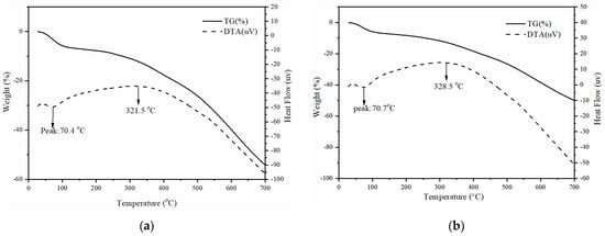 Based on the TG-DTA curve of the pre-AMBC in Figure 4a, it can be seen that the trend of the TG curve of the pre-AMBC is consistent with that of the AMBC. Throughout the entire temperature range (28–700 °C), the weight loss rate of the adsorbent reached 54.0%. The corresponding DTA temperature was 70.4 °C, which was consistent with the endothermic peak of AMBC, indicating that it also contributed to the removal of physically adsorbed water from the biochar.
